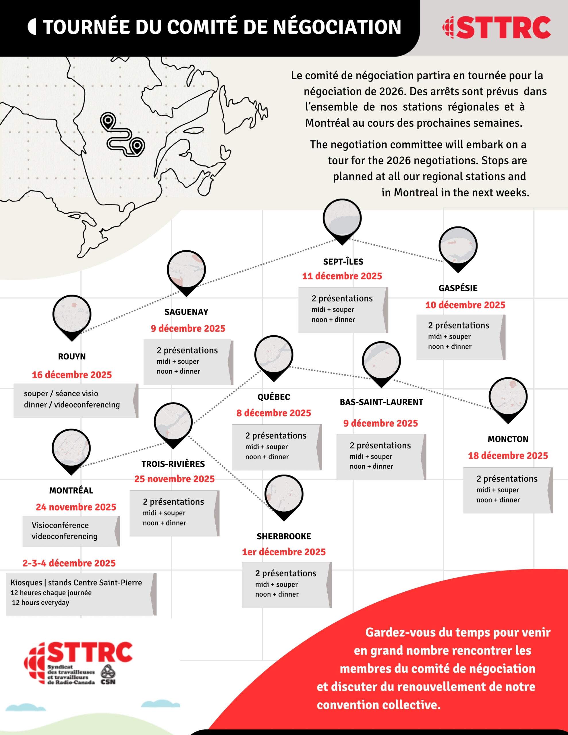 Un premier pas dans cette négociation a été franchi le 10 juin 2025 alors que les membres du STTRC ont approuvé, en Assemblée générale extraordinaire, les candidatures des membres du comité de négociation qui avaient été recommandées par le conseil syndical.